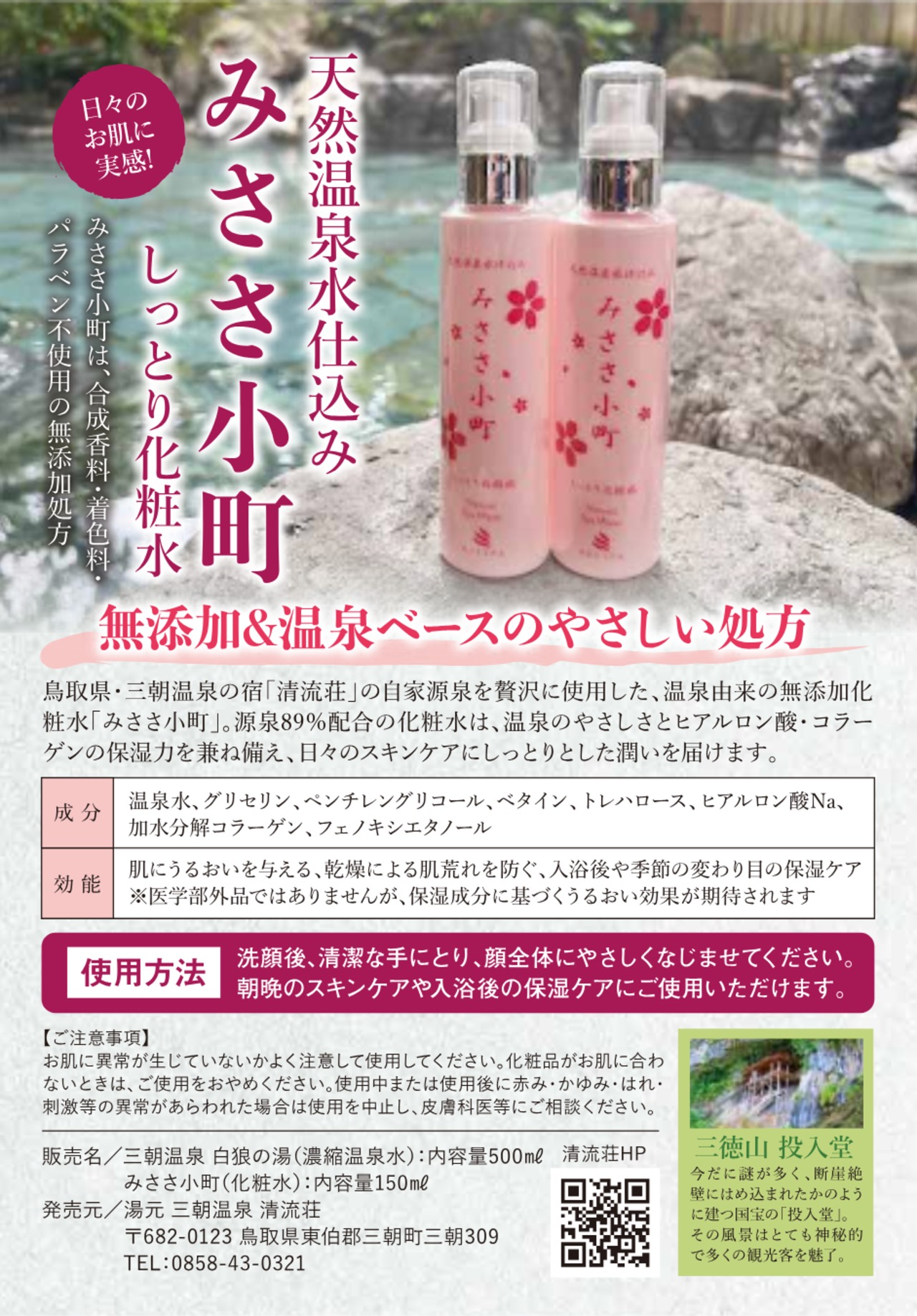 鳥取県・三朝温泉の宿「清流荘」が、自家源泉から汲み上げた温泉水を贅沢に使用し、肌にやさしい無添加処方で仕上げた温泉由来の化粧水です。